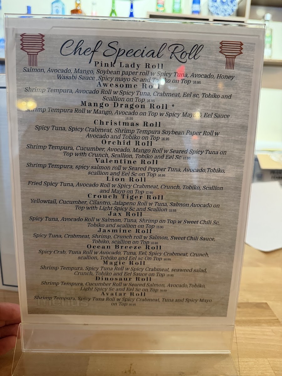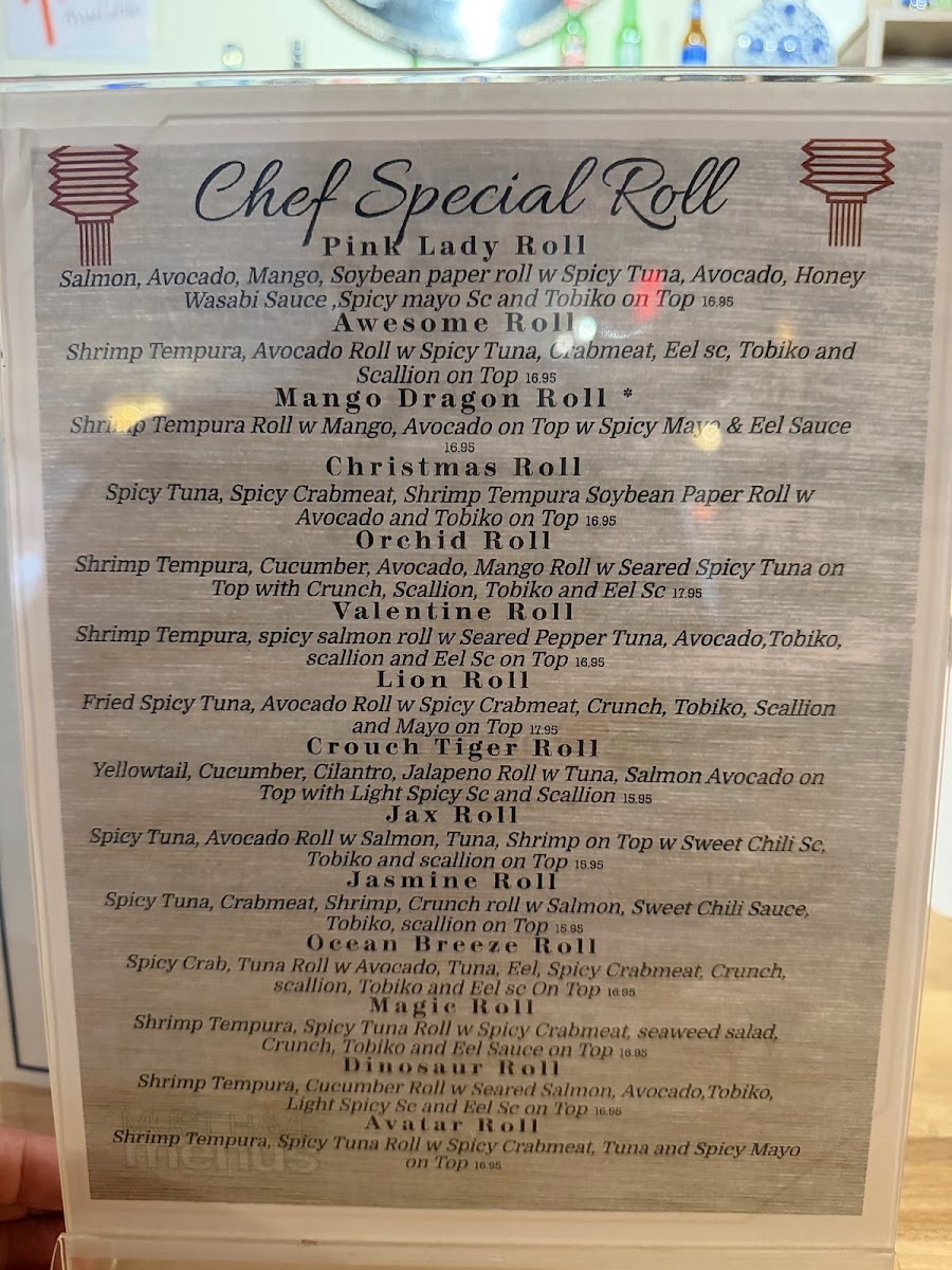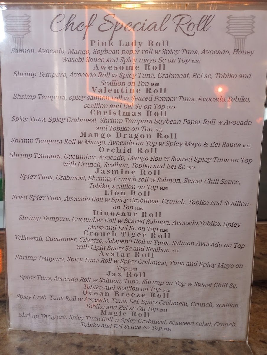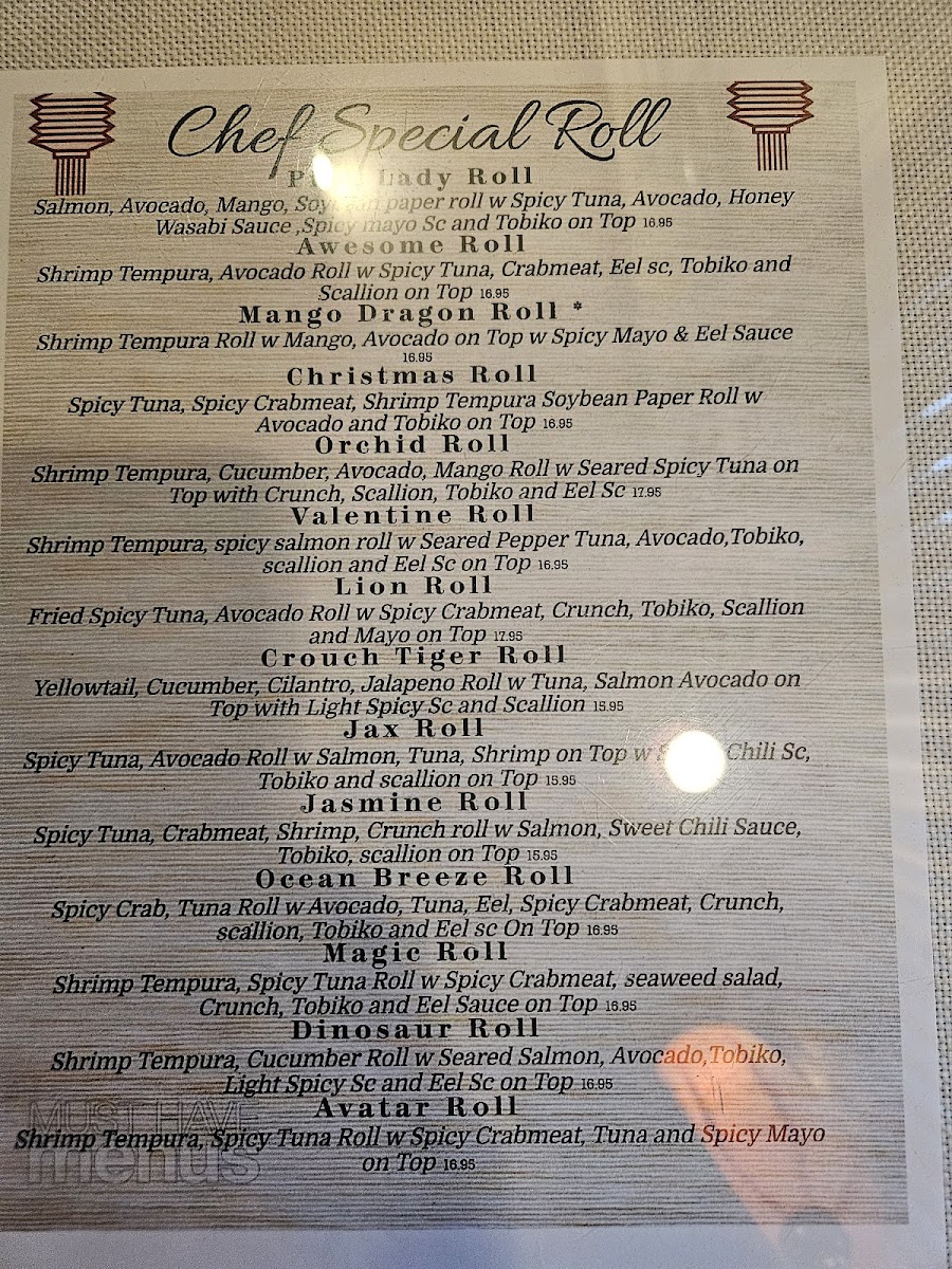 Guests can find a balance of lighter options like edamame, sunomono, and salads alongside heartier choices such as teriyaki beef and fried rice. Specialty rolls and sushi combinations cater to those looking for variety, while unique appetizers from both land and sea, like grilled lamb chops or coconut scallops, add a touch of creativity.